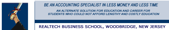 Congratulations……… On your career development plans. We welcome you at our Web site and ready to go ahead with your plans, and will be ready to be a part of your project……in a win…win situation. RealTech Business School, Inc. is providing training in various specialized accounting, bookkeeping, payroll and taxation cources, and can help you to choose the most suitable fit into your background, goals, budget, time, taste, current job, change of job, growth at current job, switching employment and several other personal factors those you can share without any hesitation and obligation. Why Accounting Programs only… Training in accounting and taxation programs is big challenge and is considered to be hard to teach and hard to learn for some people. But at the same time it has a vast and ever growing job market. Accounting profession is a secure and growing area. One can start from entry level and be a Staff Accountant. Promotional opportunities are great. Accountant and Bookkeeper work in very professional and office environment some time it is called 9 To 5 job, Saturday-Sunday closed, no night shifts or odd hours, and can avail with all health insurance and other corporate benefits. Accounting Profession sound hard and complicated to some people. But be confident it is not….you need little dedication and interest, we will never let you down. Accounting Profession has been divided in several segments and components such as Data Entry, Bookkeeping, Accounts Receivable, Accounts Payable, Billing, Bank Reconciliation, Payroll Accounting etc. at entry level and full charge bookkeeping, public accounting, staff accounting, finance controlling, financial statements & auditing etc. at higher end. Realtech Business School was able to select some of the accounting functions segments and has introduced programs accordingly to the best suiting for accounting profession, employers’ needs, market needs, easy to learn and easy to perform. We are fully prepared to train you for accounting position just waiting for your visit to us. Your one visit can open a new door for new career, change of career or career development. Once again thank you for considering RealTech Business School an institution for your career objectives. Sincerely, |